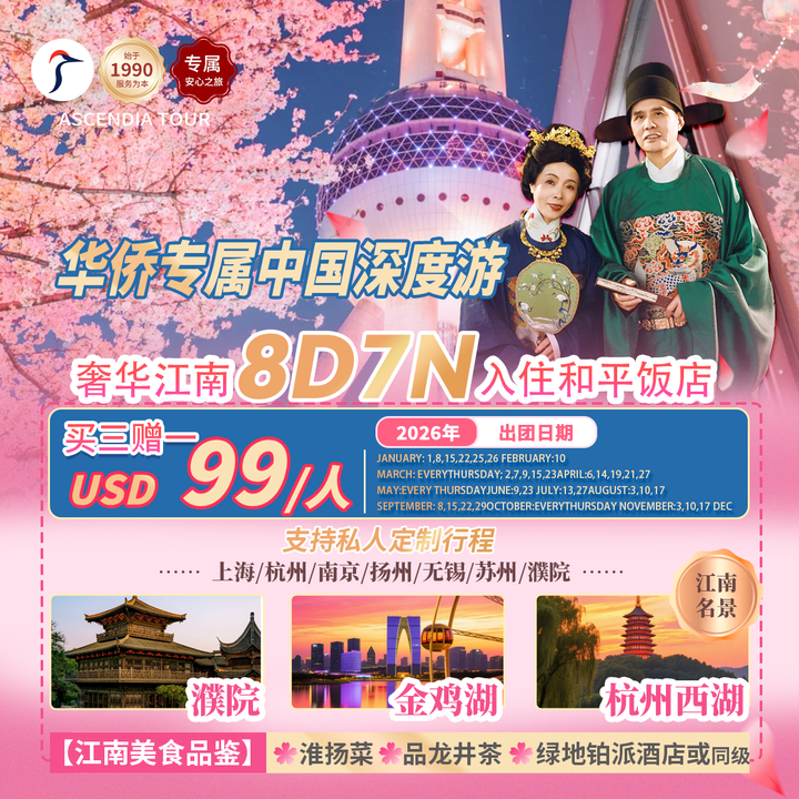 ![2026[Luxurious Jiangnan] Six Dynasties Nanjing, Huaiyang Scenic Spots, Wuxi and Suzhou Twin Peaks, West Lake's Misty Willows, Tracing the Footsteps of the Han Dynasty Academy (8 Days) tour image](http://ascendiatour.com/cdn/shop/files/Lujiazui_3.webp?v=1769408527&width=900)